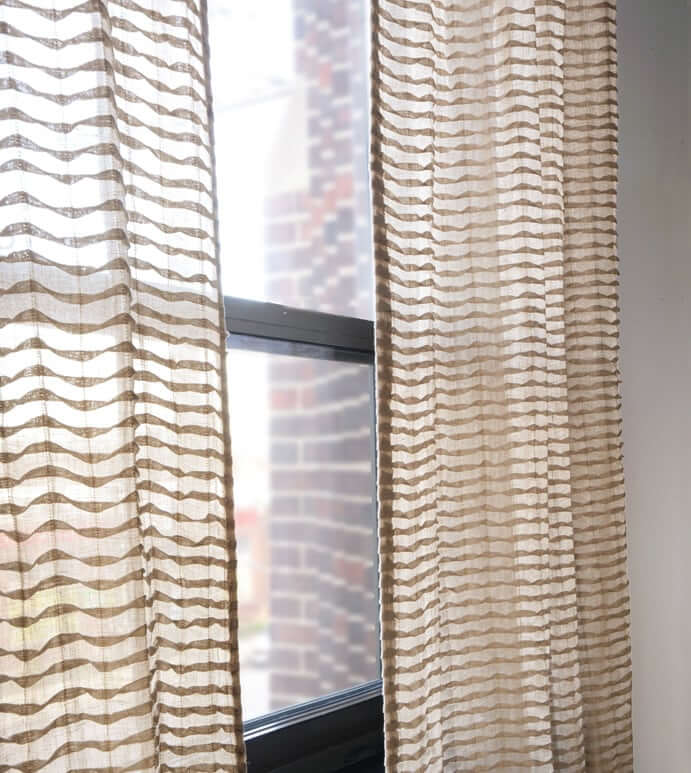 Our napped curtain linings, Vanth White and Vanth Ivory are fuzzy on one side and smooth on the other— perfectly combining standard and interlining. Ideal for use with thicker fabrics like boucle or velvet drapery, this unique lining option keeps a panel from becoming too hefty.