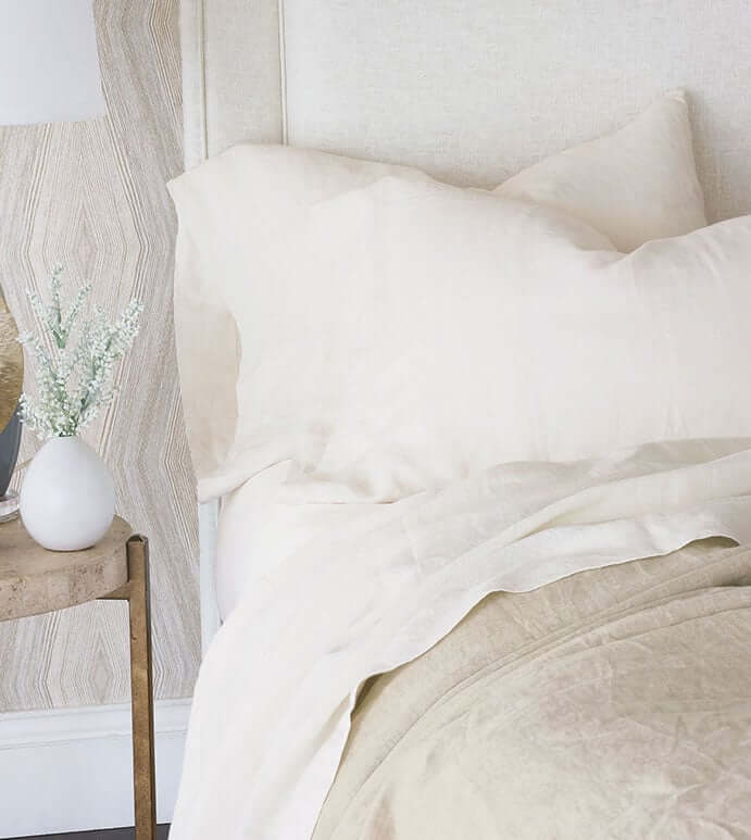 Instead of cotton, our Shiloh collection is made from 100% stone-washed linen. Linen is a strong, breathable textile made from the flax plant. The lightweight hollow fibers are quick-drying and naturally insulating, keeping you cool in the summer and warm in the winter. Linen’s durable yet airy structure boasts a natural texture that softens with every wash. Sheeting made from pure linen is great for all climates.