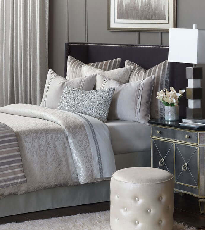 Embrace a snow-like sparkle with glittering metallics and soft, wintery whites. Glamorous bedding like Luxe feels instantly festive. Sophisticated golds, sparkling trims, and plush textiles set the scene for a winter wonderland.
