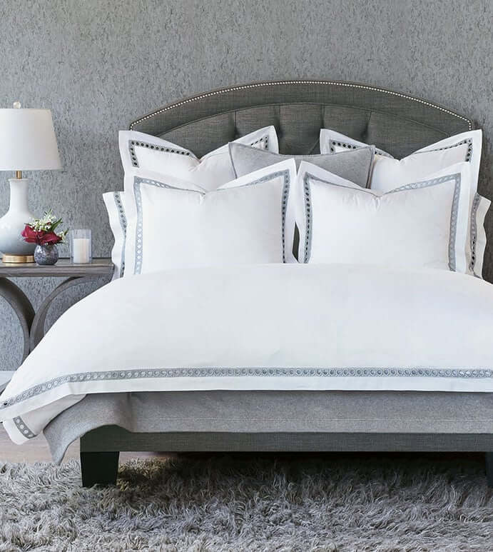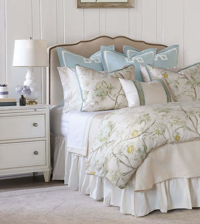 You may have seen our New Year’s toast, spotlighting something exciting. There’s more Eastern Accents glamour on the horizon with soon-to-launch Elise. And nothing pairs with soft white like a radiant metallic bedscape. Stay tuned for more about Elise!