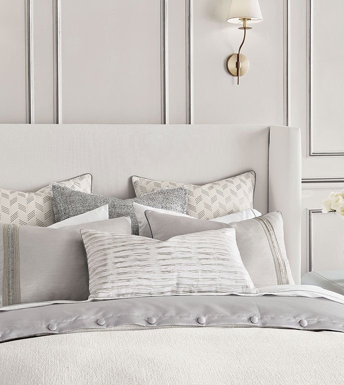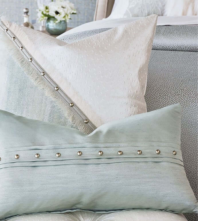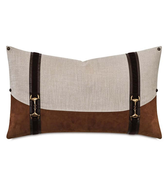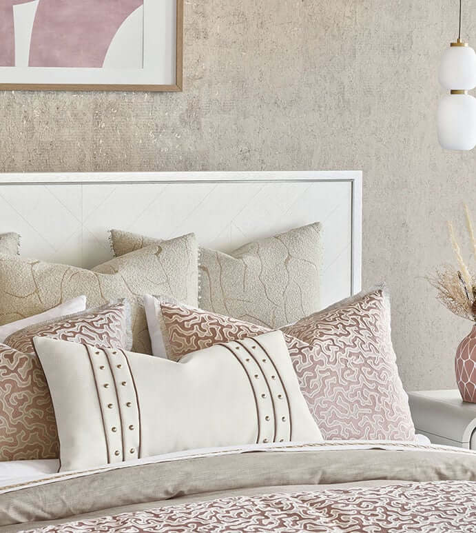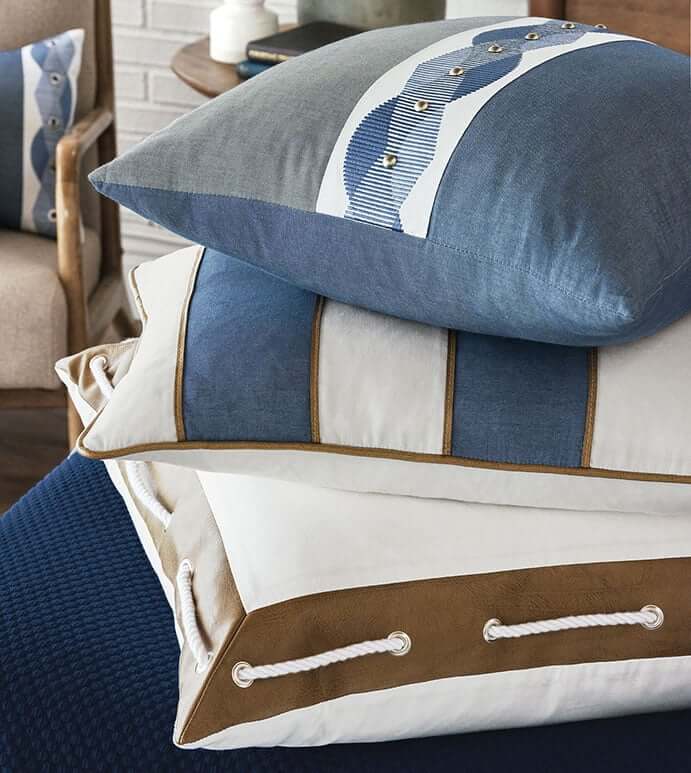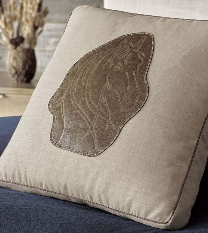 Leather trims and cords galore! Leather-type accents add classic style to a product without stealing the show. From Zelda’s modern straps to Higgins' embossed equine appliqué, leather accents continue to pop up across our luxury bedding collections.