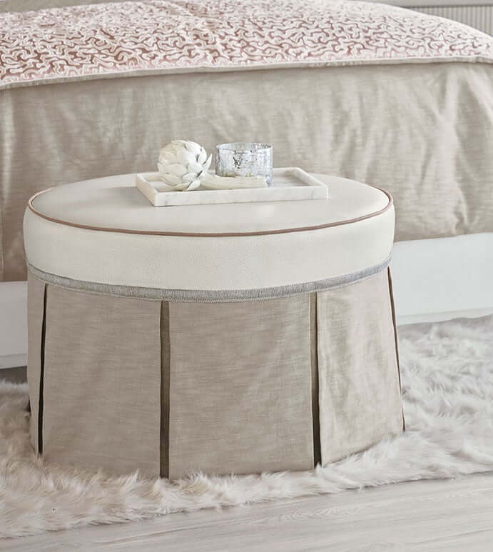 One of the most classic uses of leather in home decor is upholstered furniture. From the iconic Chesterfield sofa to modern vanity stools, both faux and real leather provide style and shine with the durability to stand the test of time. Our Emmeline Ottoman features a strong and stain resistant faux-leather seat, ideal for standing up to wear-and-tear. Finished with a pleated skirt and metallic trim, this piece is both functional and beautiful. Explore our full selection of designer leather-type furniture here, or create your very own bed or bench with our easy-to-use online rendering program. Simply select a style, enter your fabric and finishing preferences, and generate the perfect piece in minutes.