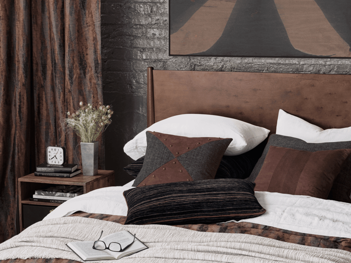 Soft velvety texture, without the price tag. Eastern Accents’ ruggedly handsome Rocco collection showcases a chocolate-brown faux suede that adds rich texture without outshining the other varying patterns. The effect is a modern masculine aesthetic, with its warm palette and outdoorsy undertones.
