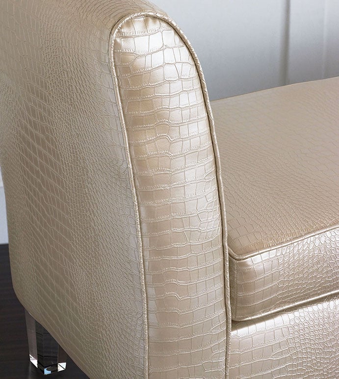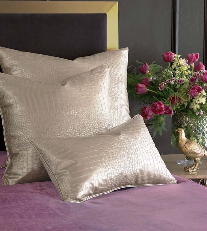 “Exotic” leathers are made from relatively rare animal species, such as ostrich, snake, or crocodile hides. Often expensive and difficult to source in large batches, Eastern Accents offers a range of specialty faux leather goods. Ostrich hide is known for its distinctive quill pattern, which created a bumped texture. Our glamorous Danae collection showcases a pearly faux-ostrich hide, pairing its elegant shine with delicate embroidery and classic damask pattern. Dramatic Valentina’s faux-snakeskin shines next to mulberry velvet and glittering metallics.