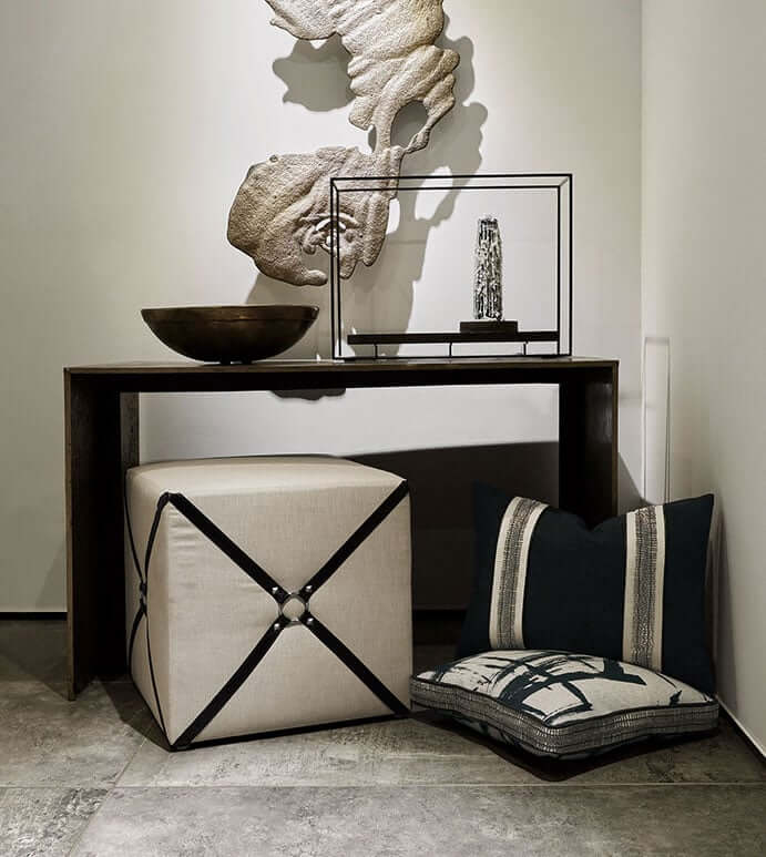 One of our 2025 releases, Tilda, features a unique leather cow hide. This stunning textile, Hera Selenite, is embossed and printed with a metallic design. A modern take on classic stylings, our Tilda collection features leather pillows and a bench-made upholstered ottoman.