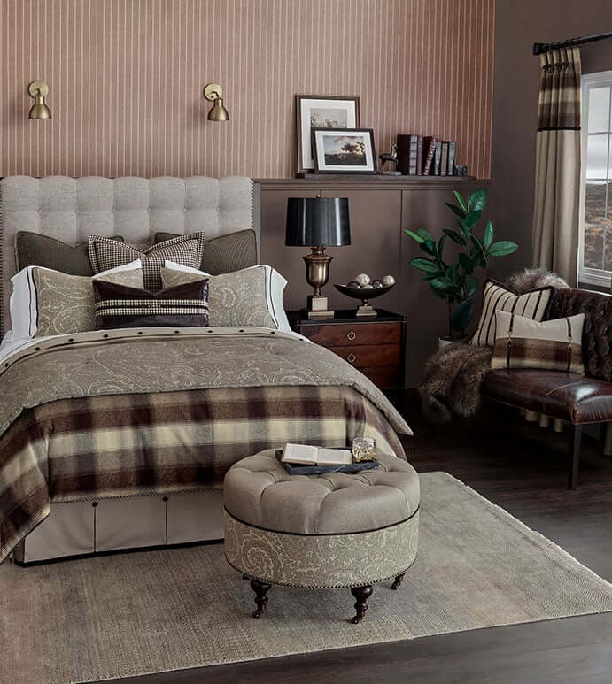 If you stopped by our showroom at High Point this fall, you probably saw our newest debut, the Highland luxury bedding collection. Sophisticated and masculine, Highland is full of rich textures and tailored details. In Highland, and across many of our gentlemanly collections, you’ll see classic patterns like houndstooth, plaid, or checkers. Rich, dark, and traditional, these looks instantly feel cozy and timeless—perfect for the colder seasons.