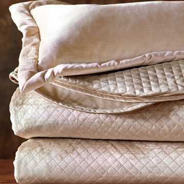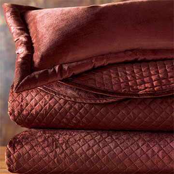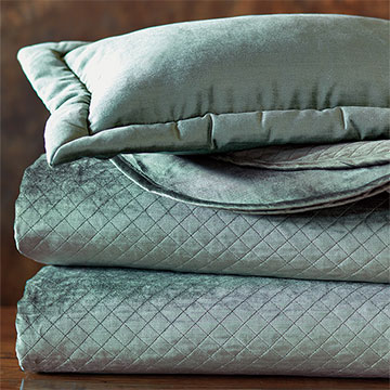 Presenting Lucerne, Eastern Accents' elegant velvet collection. Available in seven lush colors, Lucerne features decadent quilted coverlets and bed skirts in ruffled and pleated styles. Shams, throws, curtain panels, and decorative pillows complete the grand collection. Custom monogramming is available on select pillows. Choose from three font styles and three thread colors.