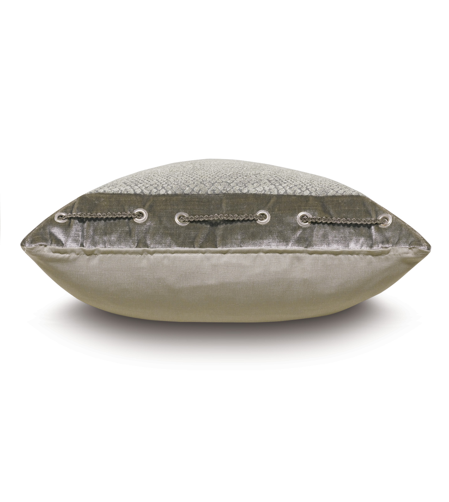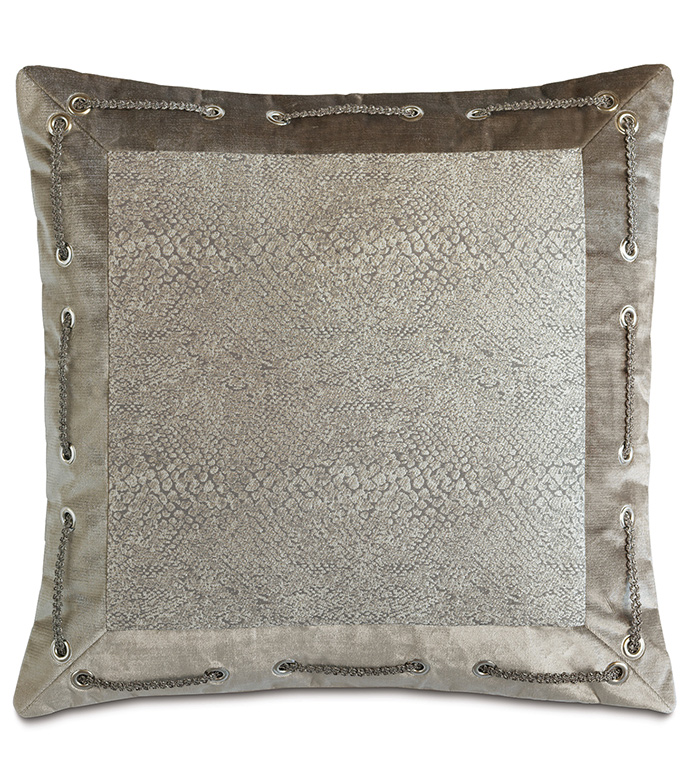 - Faux snakeskin fabric face with velvet mitered edges and gimp through grommets