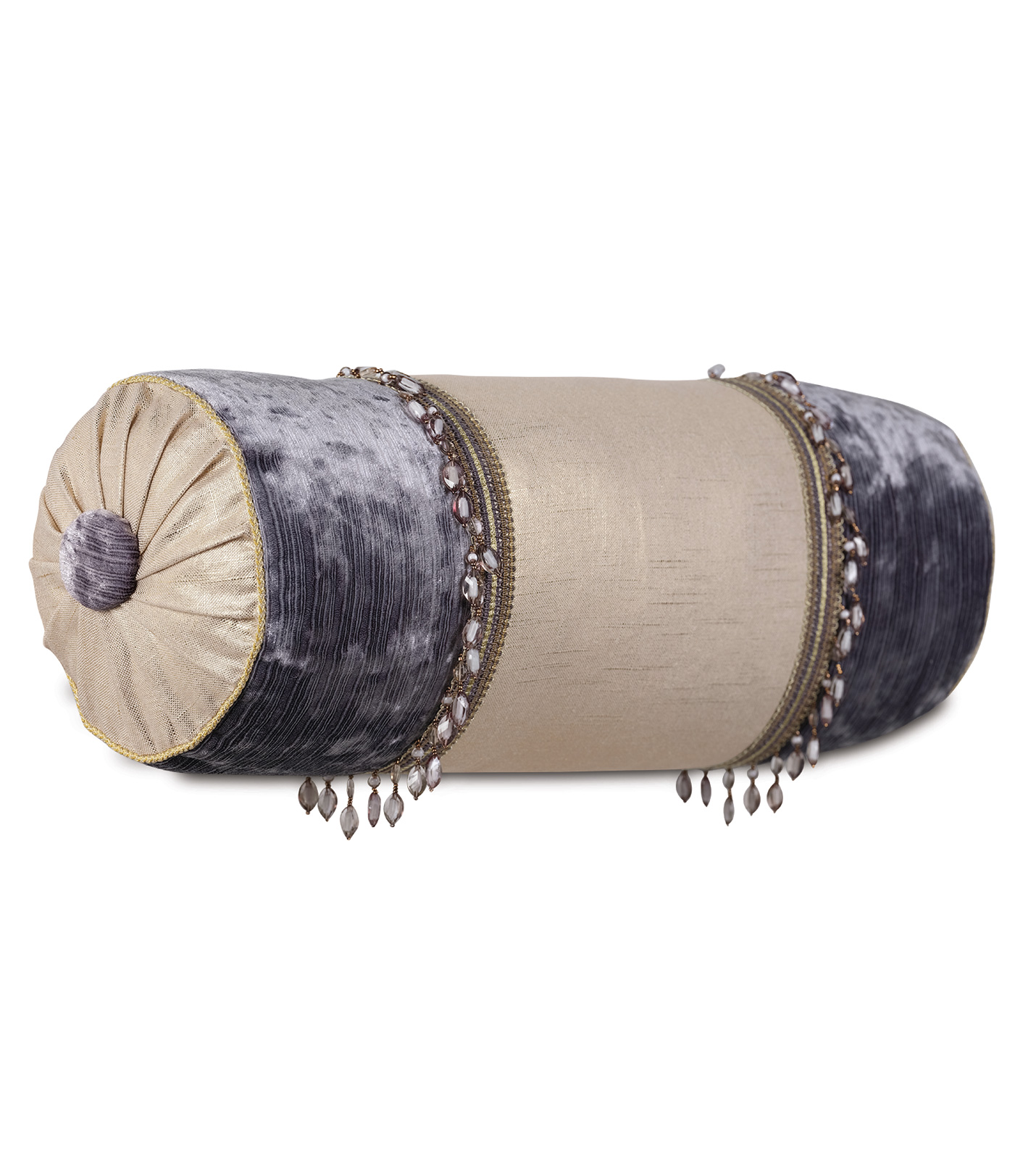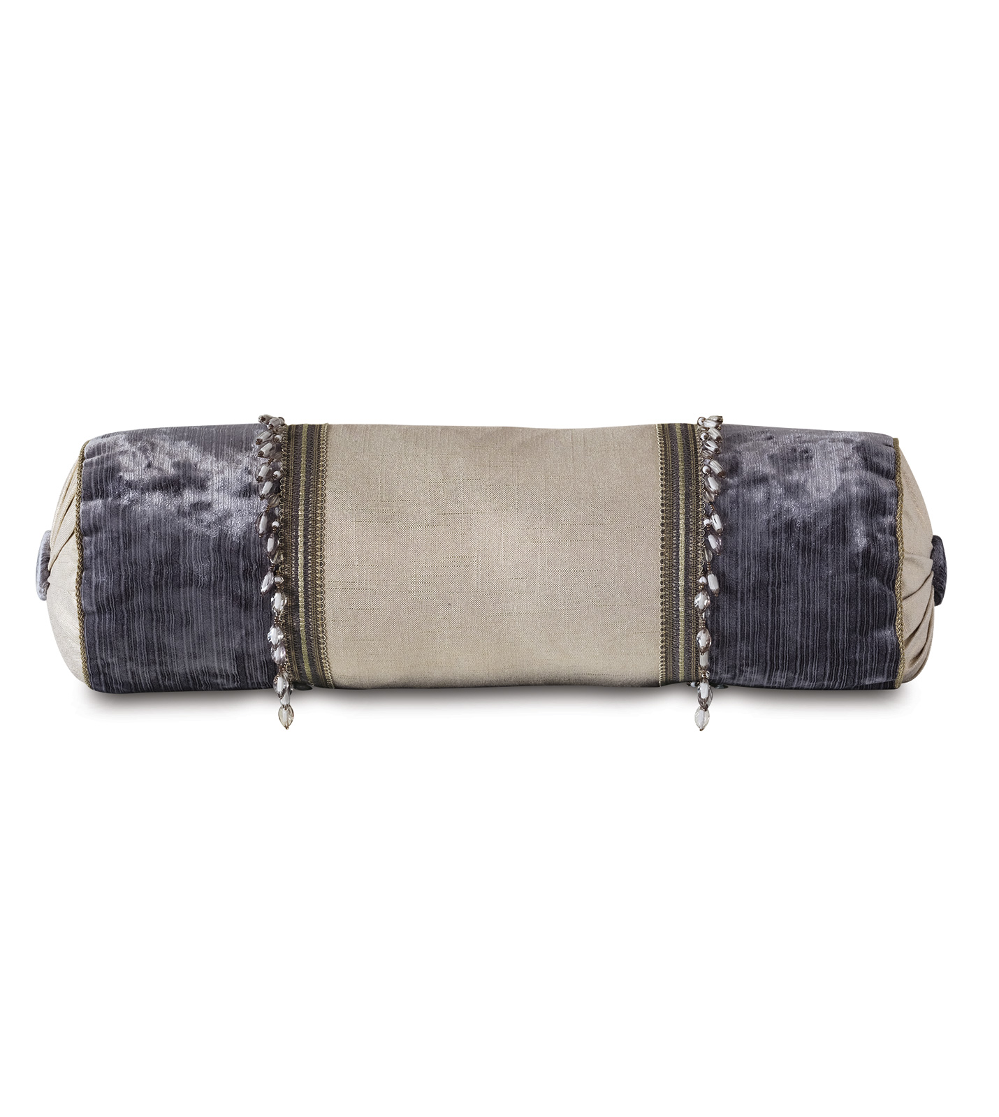 - Bolster in textured velvet with a metallic fabric insert and beaded trim application