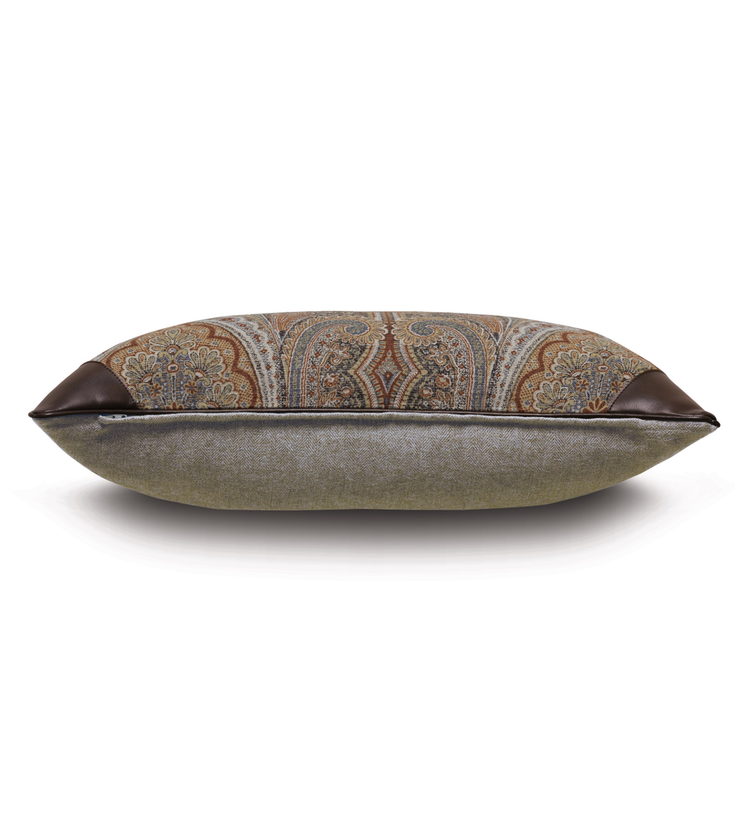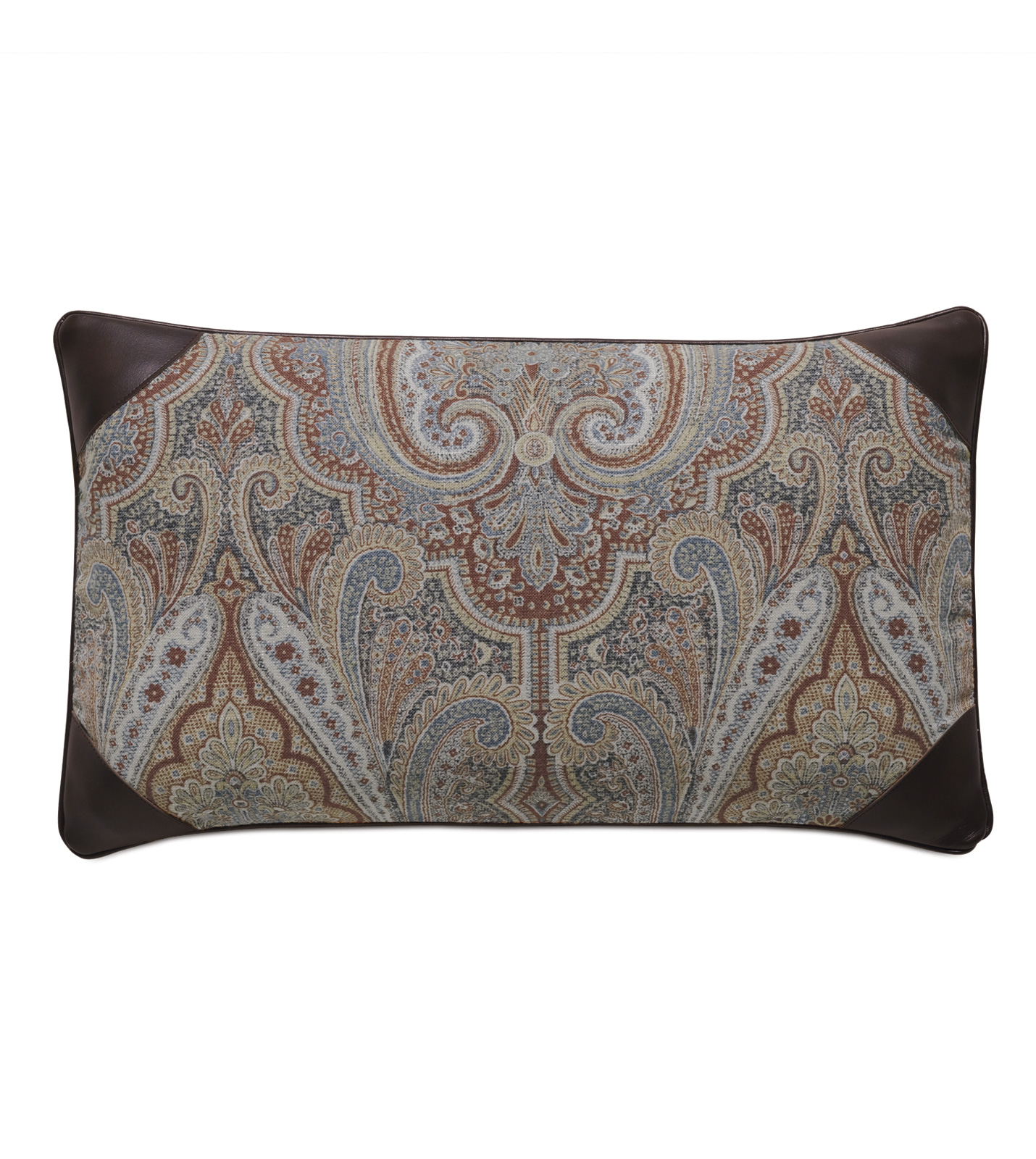 - Multicolored decorative pillow featuring a paisley design and faux leather corners
