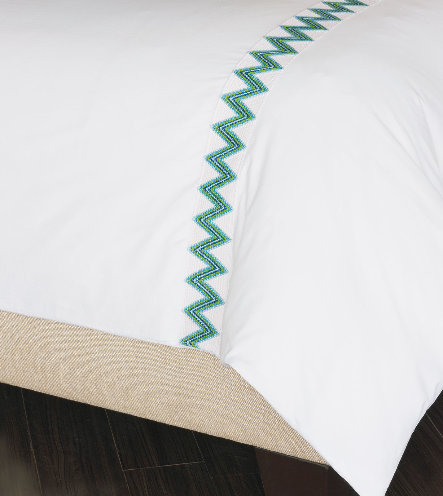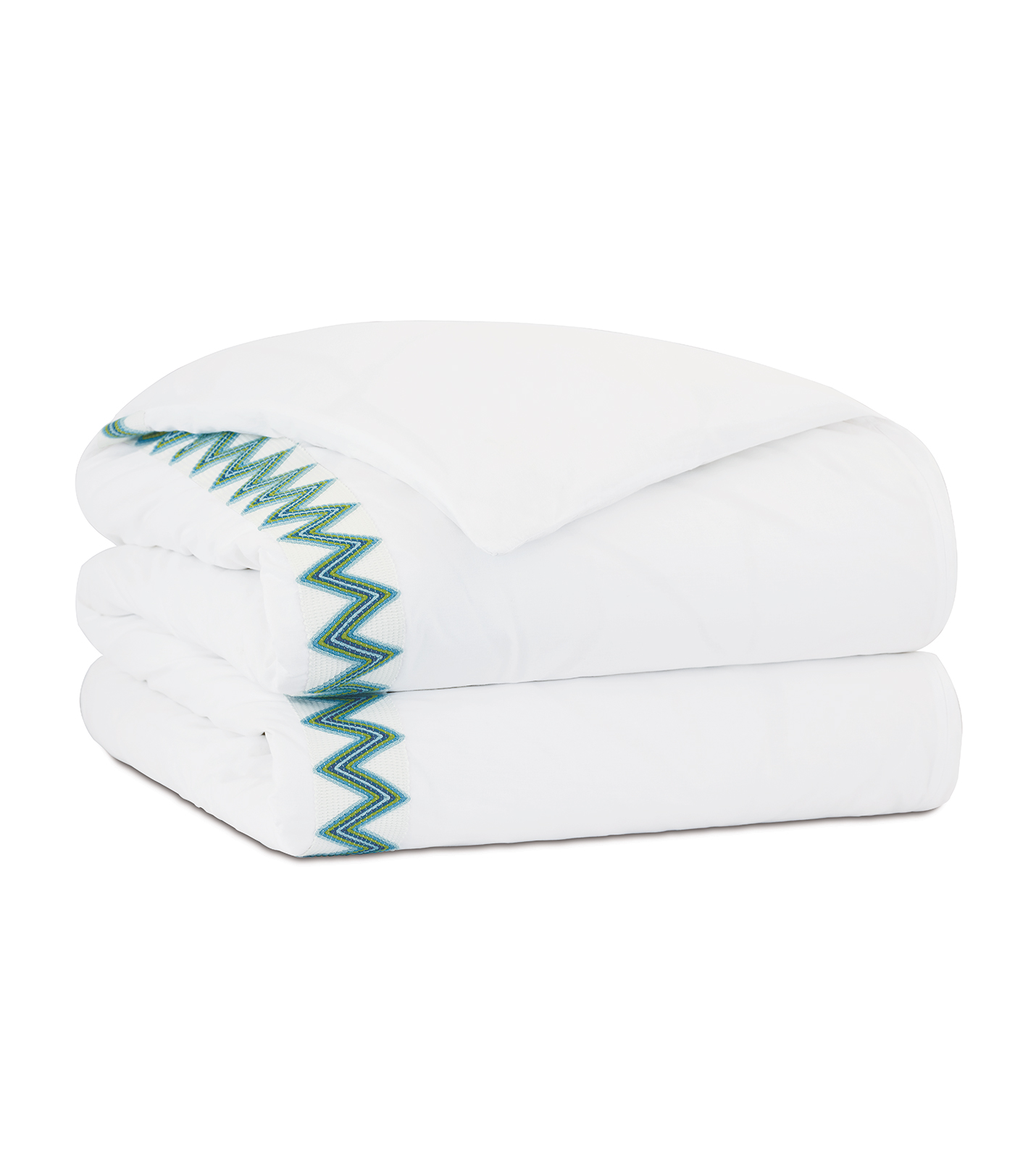 - White duvet cover in 100% cotton with chevron pattern border applique