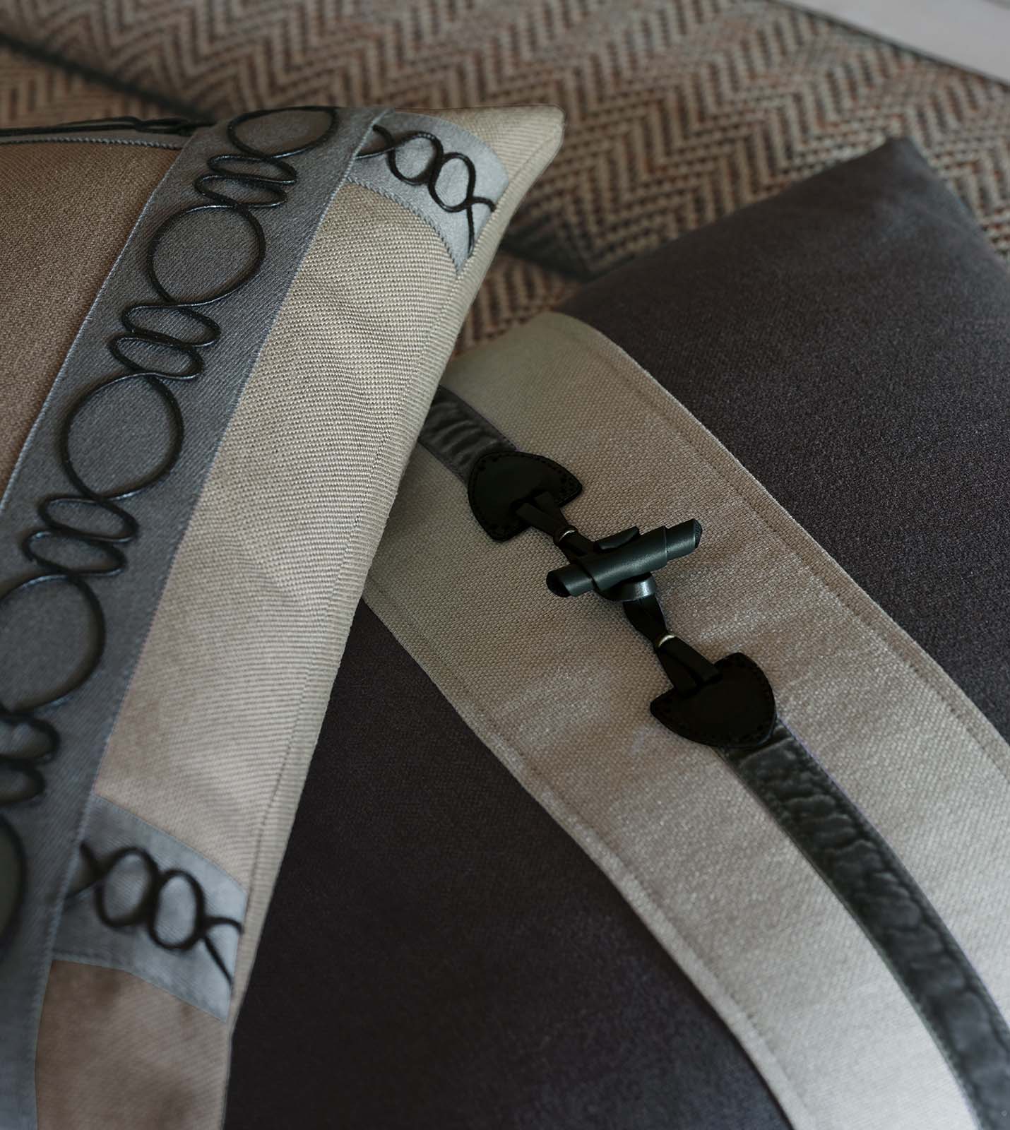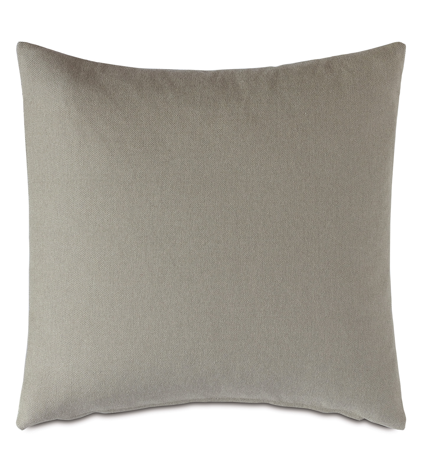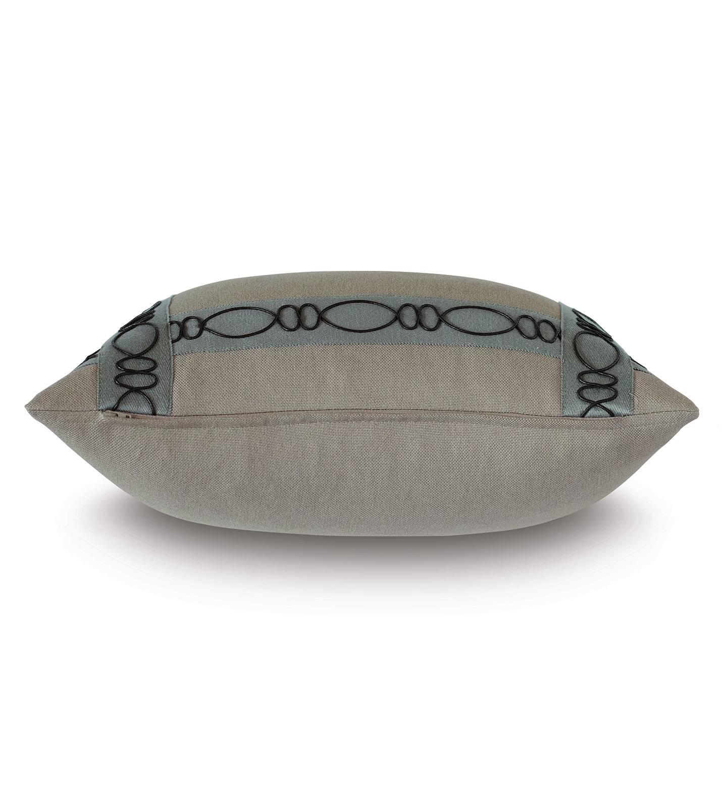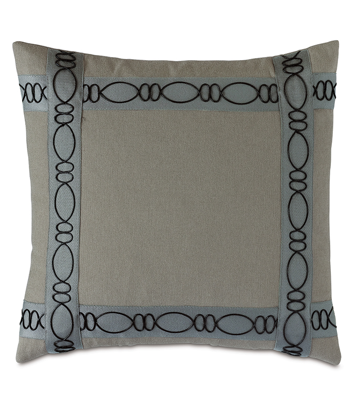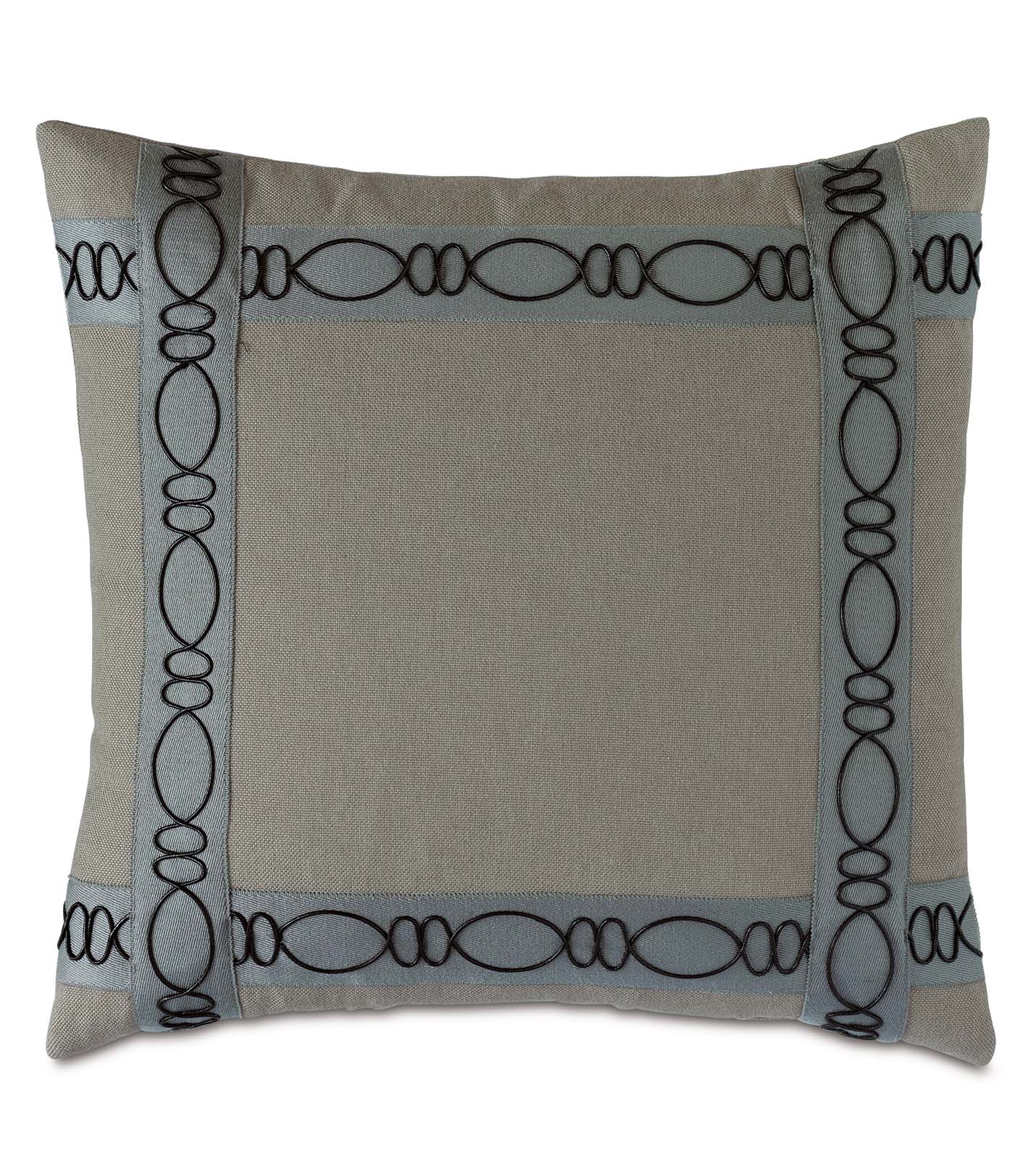 - Beige decorative pillow in a solid, performance fabric with geometric border trim