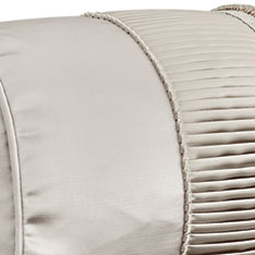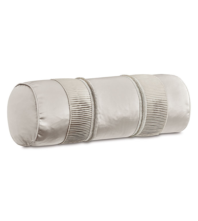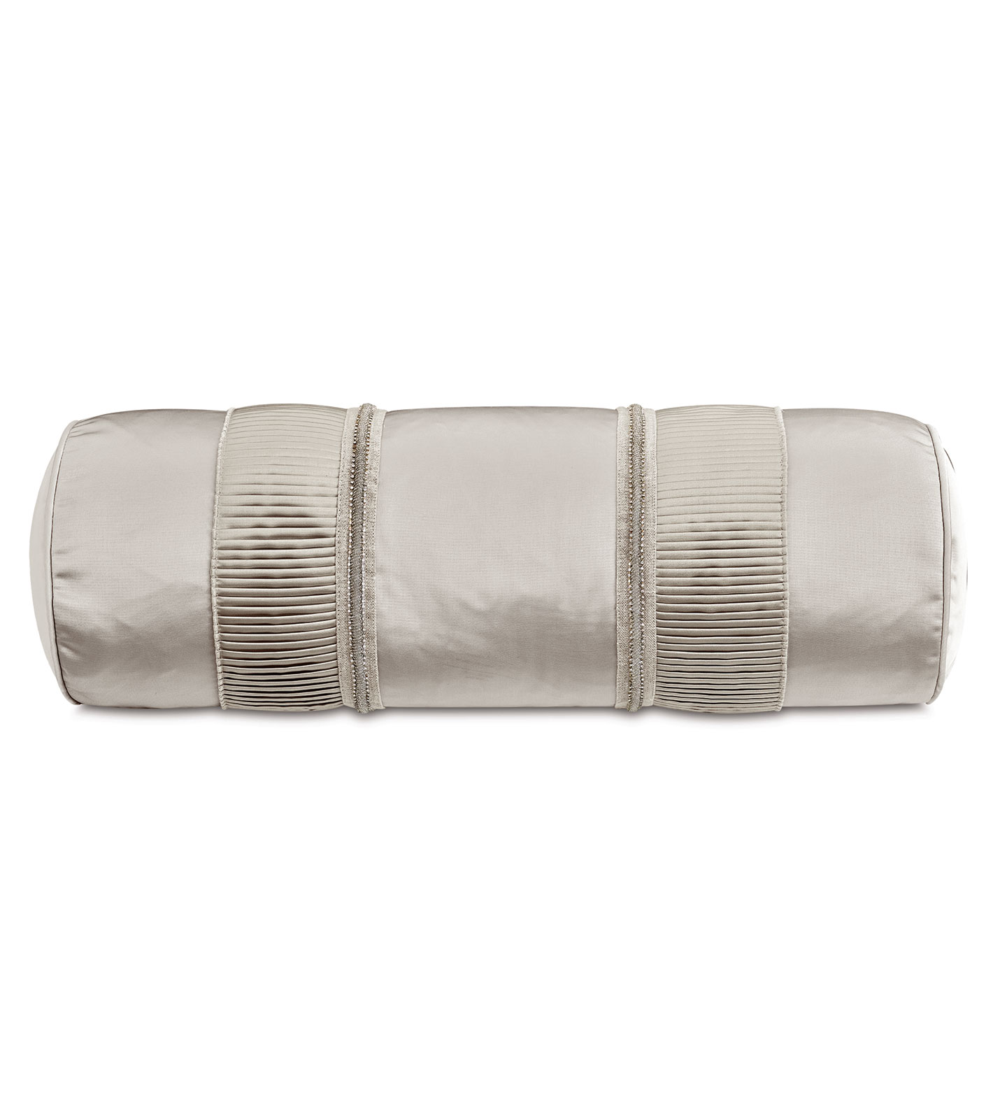 - Satin-effect ivory bolster featuring beaded trim and pleated border on face