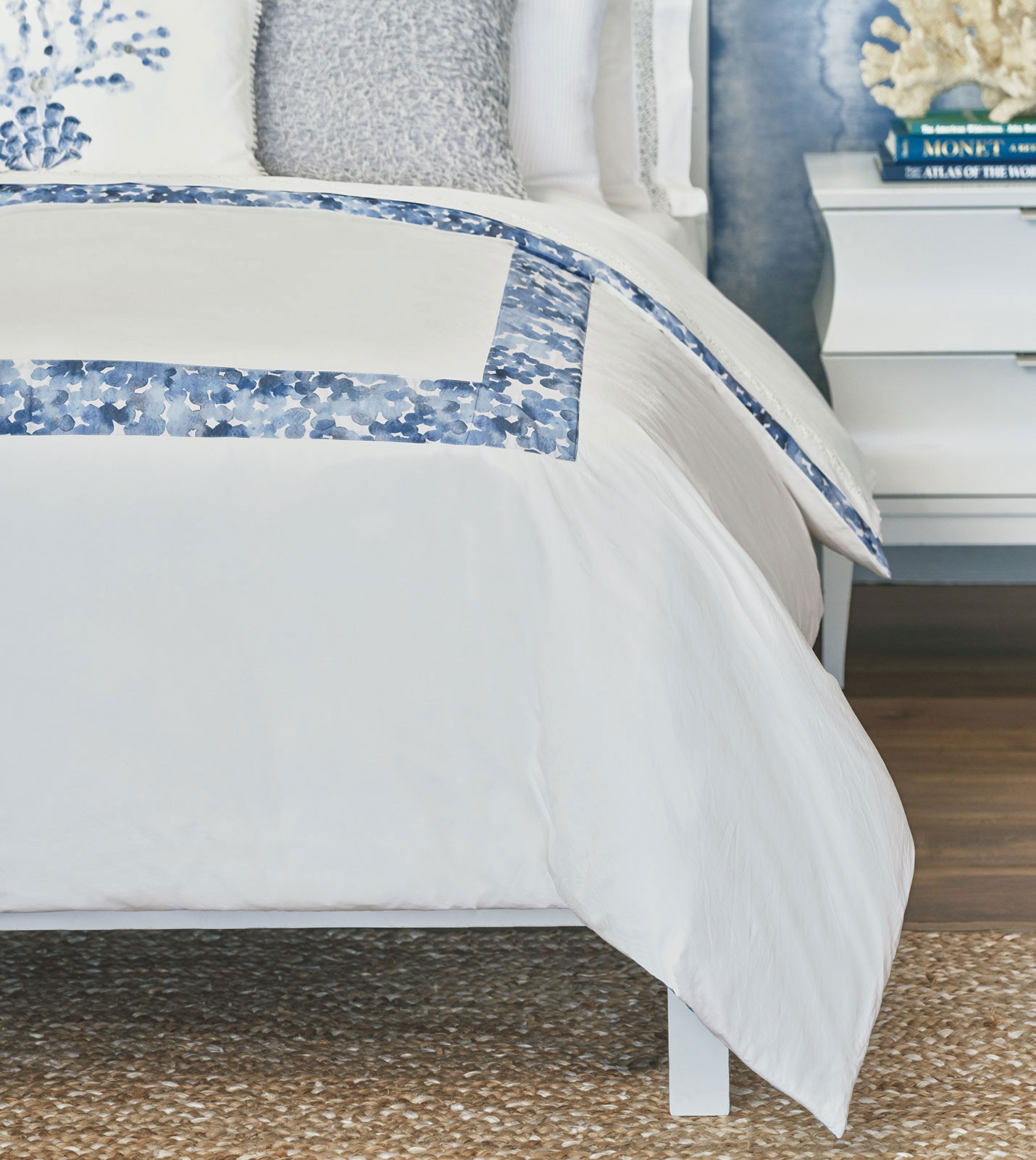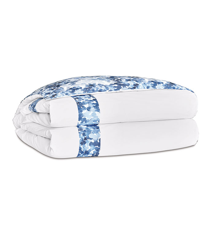 • 100% cotton duvet cover or comforter in 200 thread count percale with a 4" mitered border in a blue watercolor printed fabric.