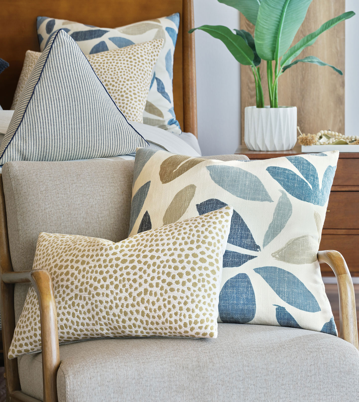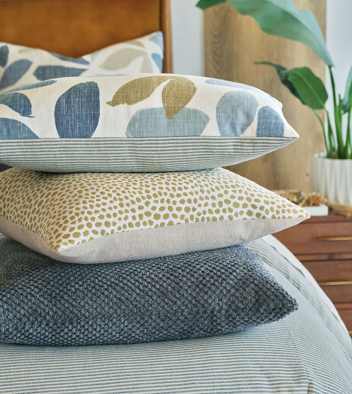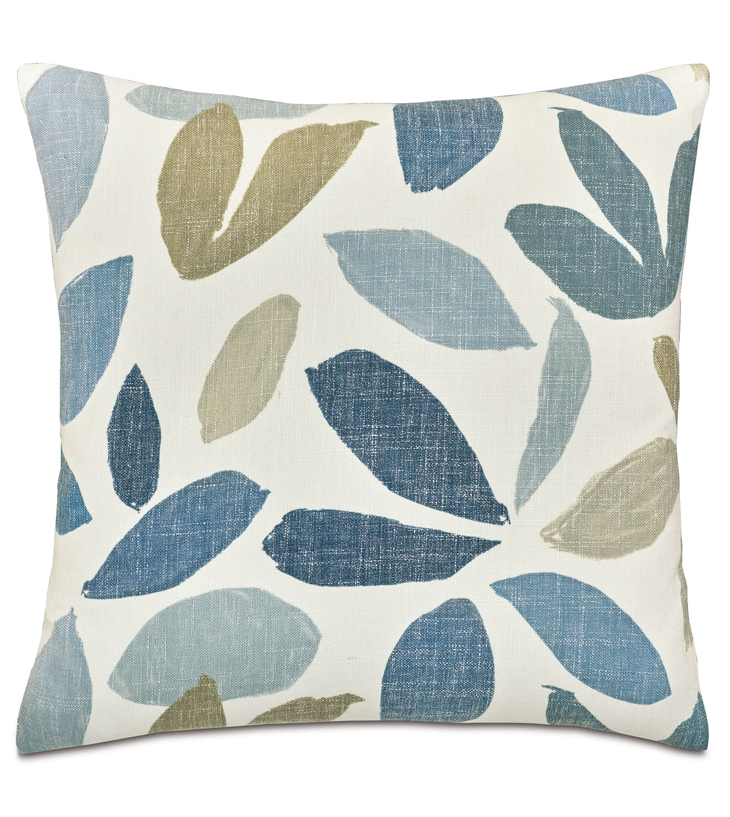 Casual and contemporary, our Mira Leaf Decorative Pillow dresses your bed with clean lines and cool colors. Serene shades of blue, ochre, and pear float across the sham to form an organic, abstract leaf pattern. Pair with the rest of our Mira bedding collection, or mix-and-match to create your own bespoke bedscape.