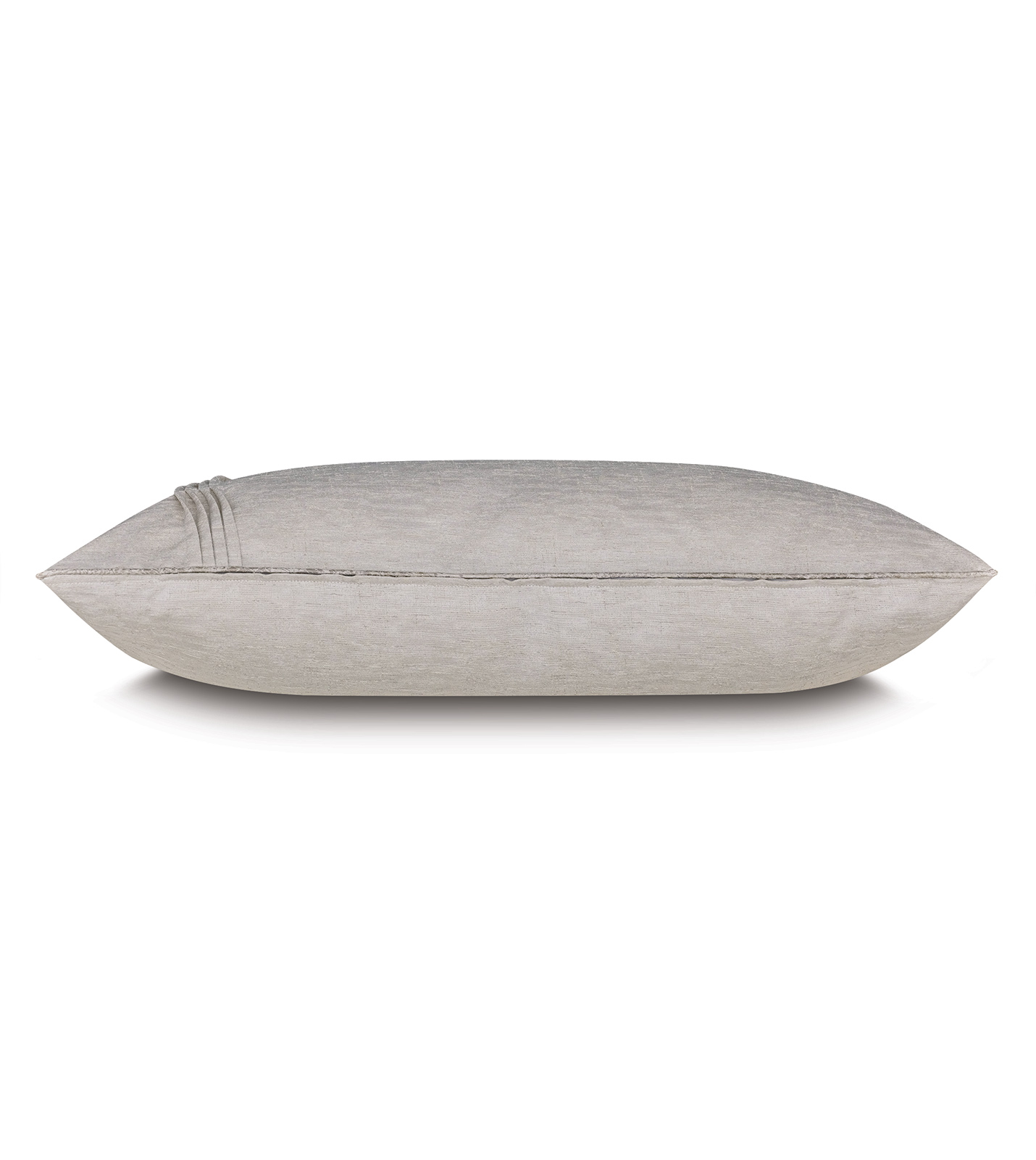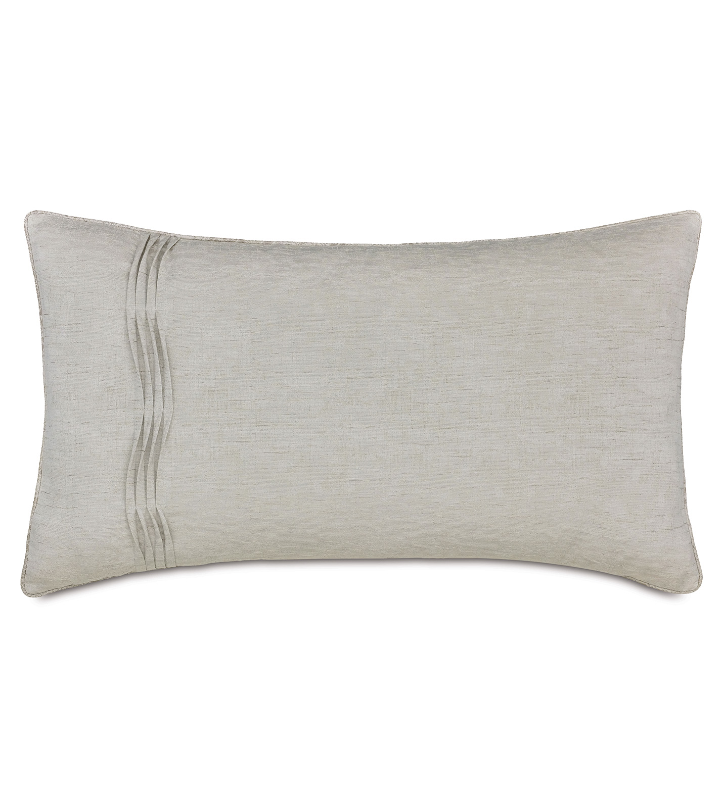 - King sham in an ivory sheen fabric with four vertical rows of pleated detail on the left end