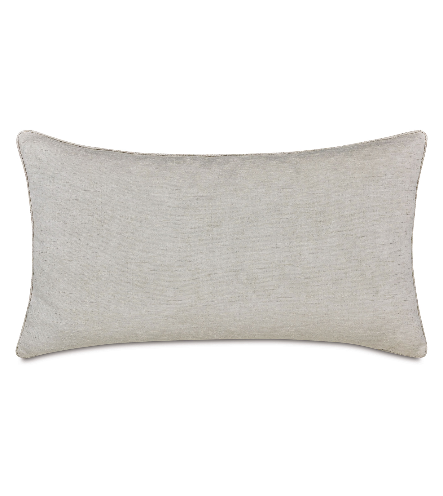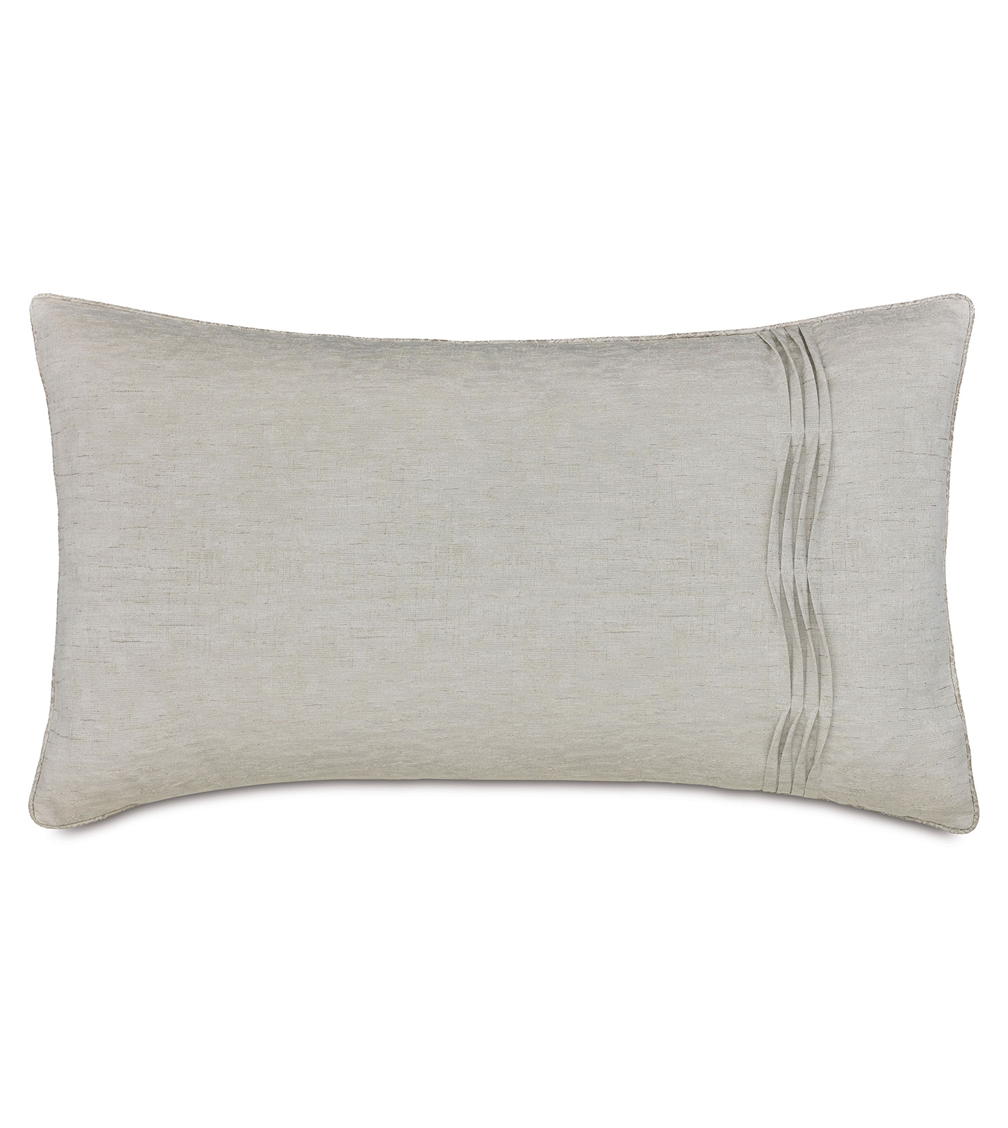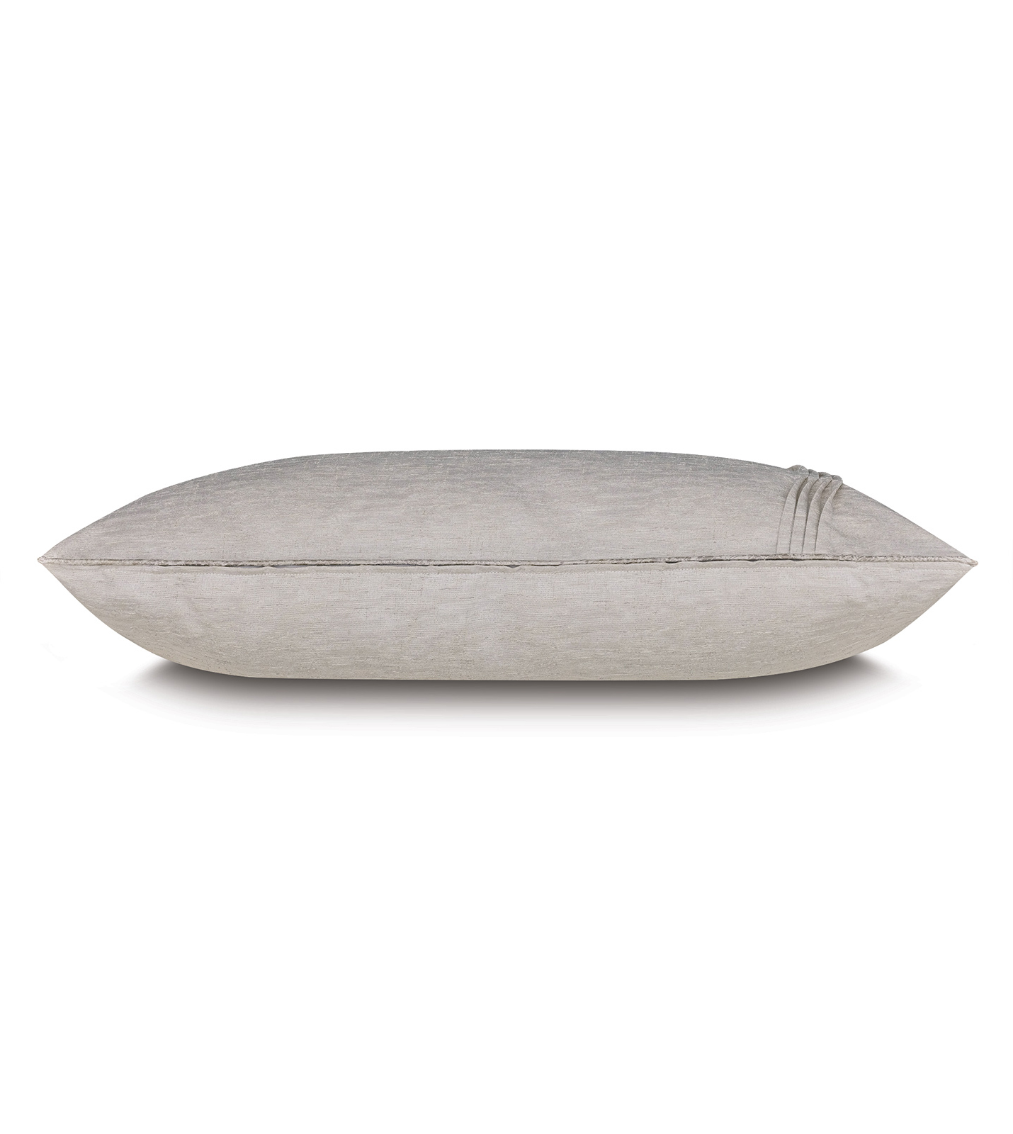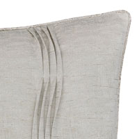 - King sham in an ivory sheen fabric with four vertical rows of pleated detail on the right end