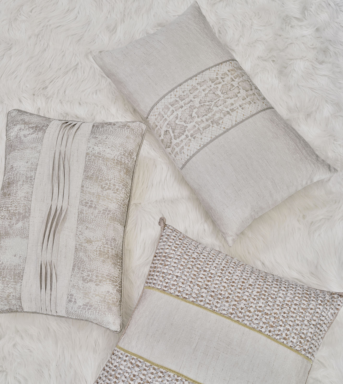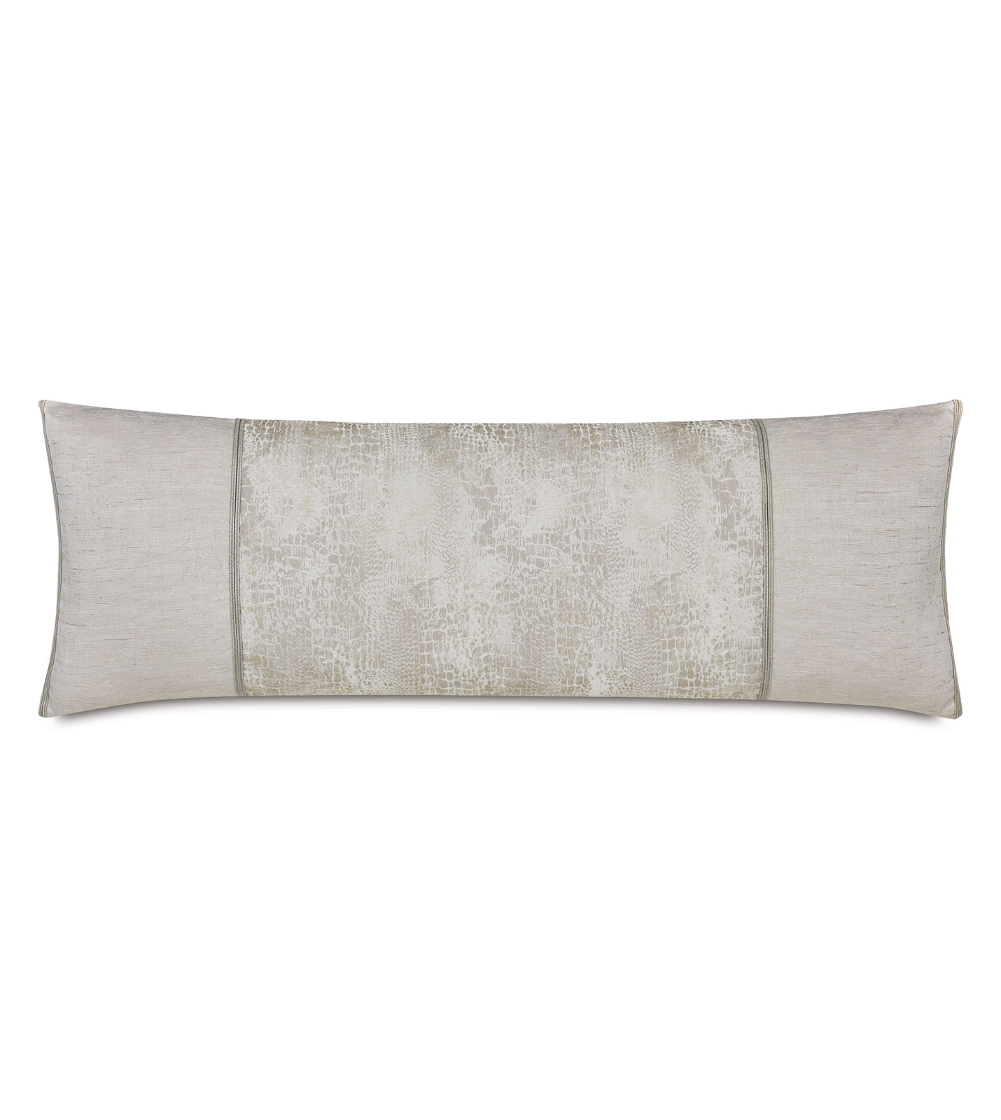 - Luxurious pieced decorative pillow featuring an animal-inspired pattern centered between an ivory sheen fabric and two gold metallic gimps sewn on each face seam