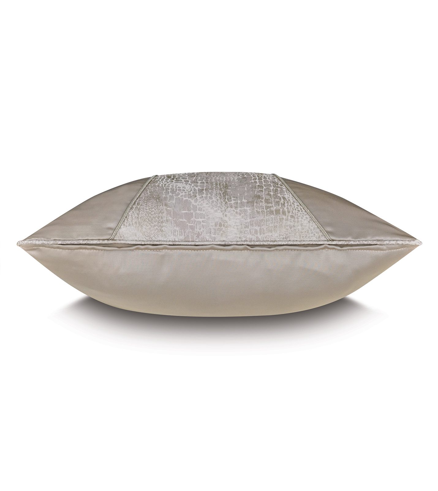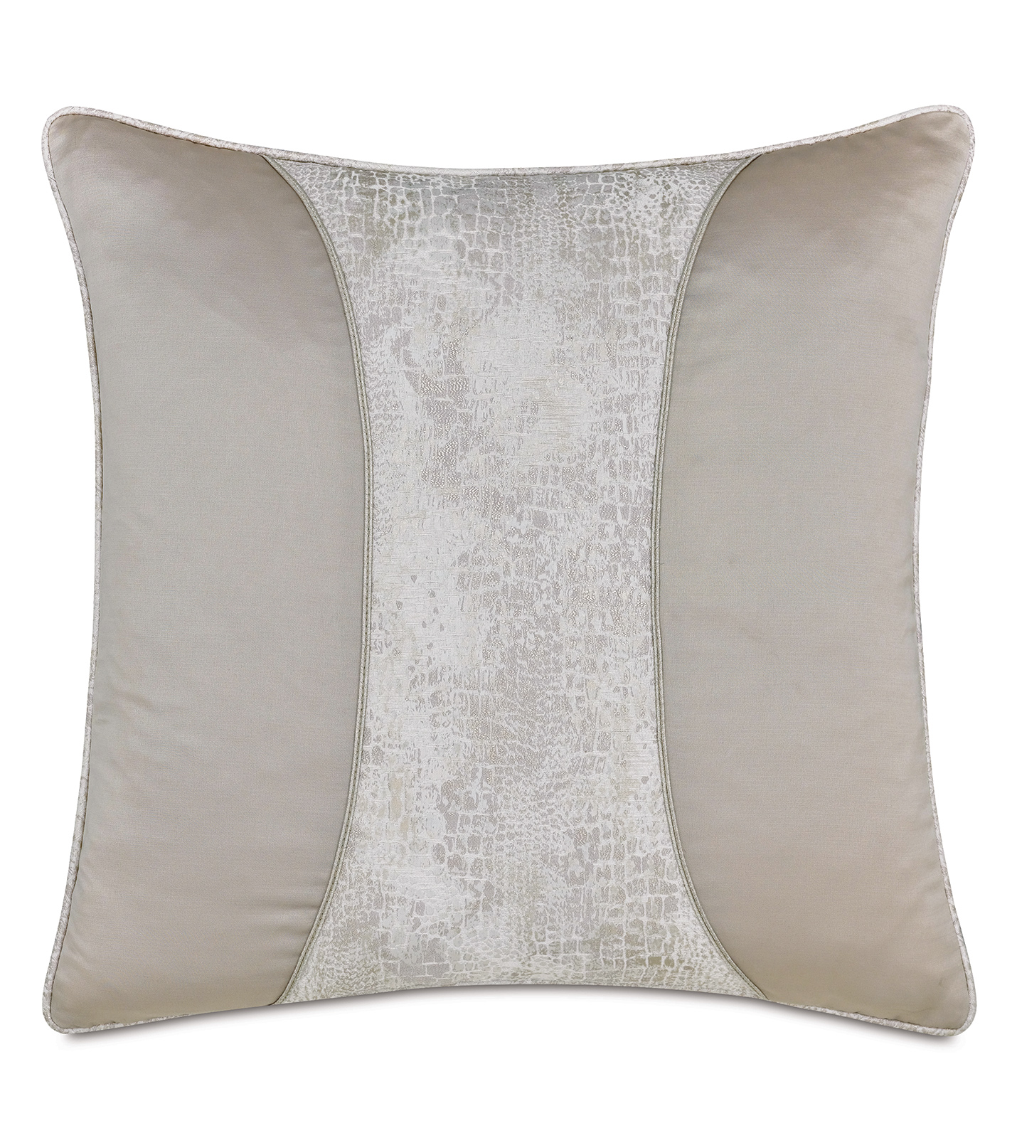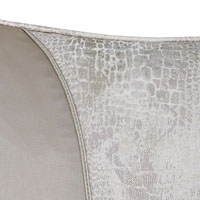 - Satin ivory decorative pillow pieced with a jaqaurd fabric featuring an animal-inspired pattern with two metallic gimps sewn vertically on face seams