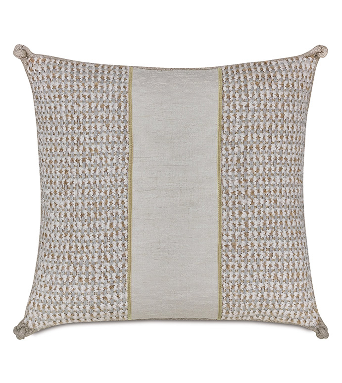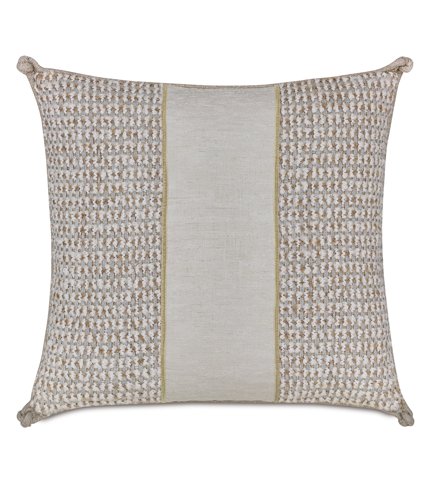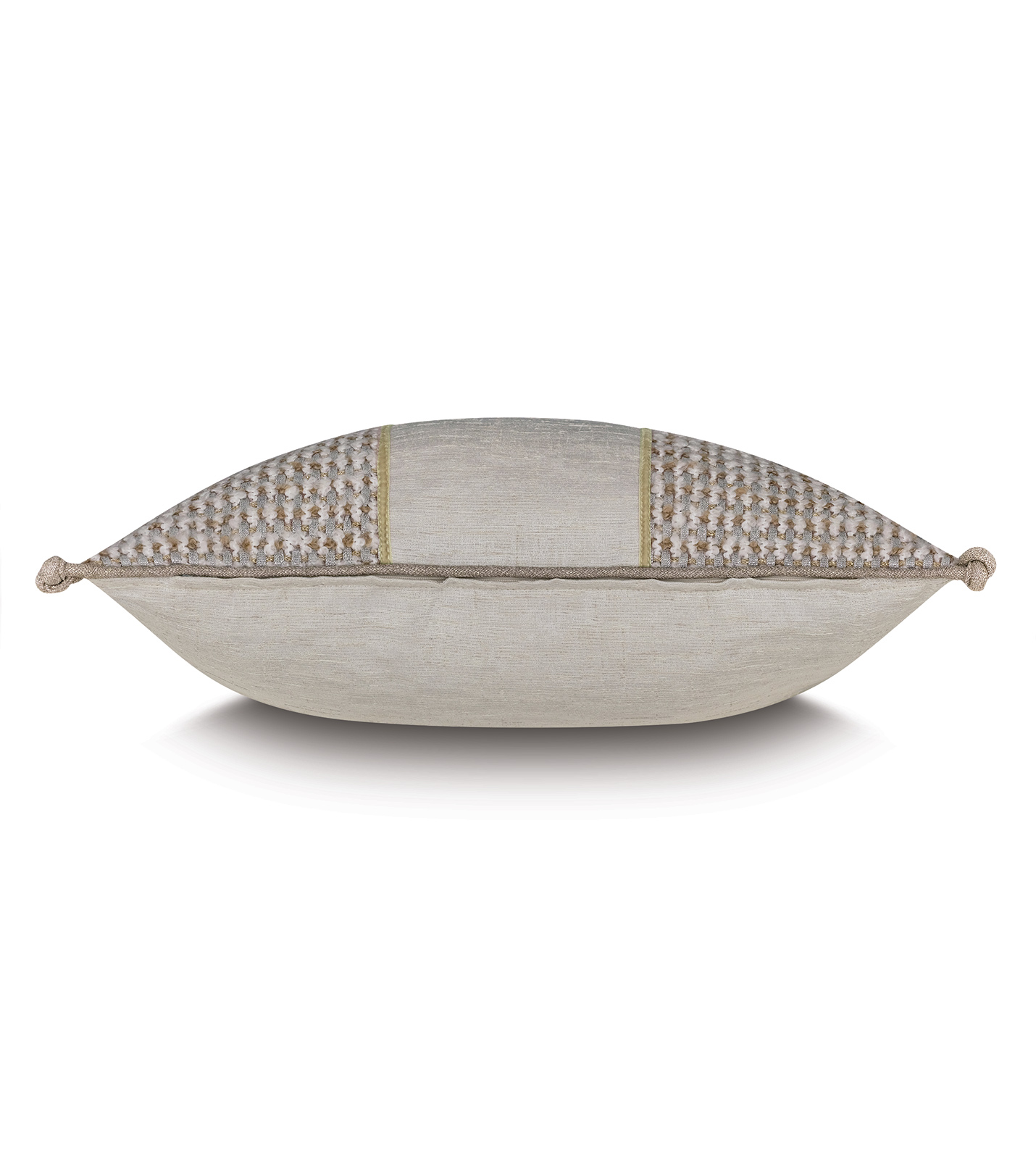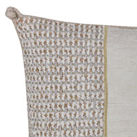 - Decorative pillow pieced with a richly textured fabric featuring metallic threads and an ivory sheen fabric with gold ribbon sewn on face seams