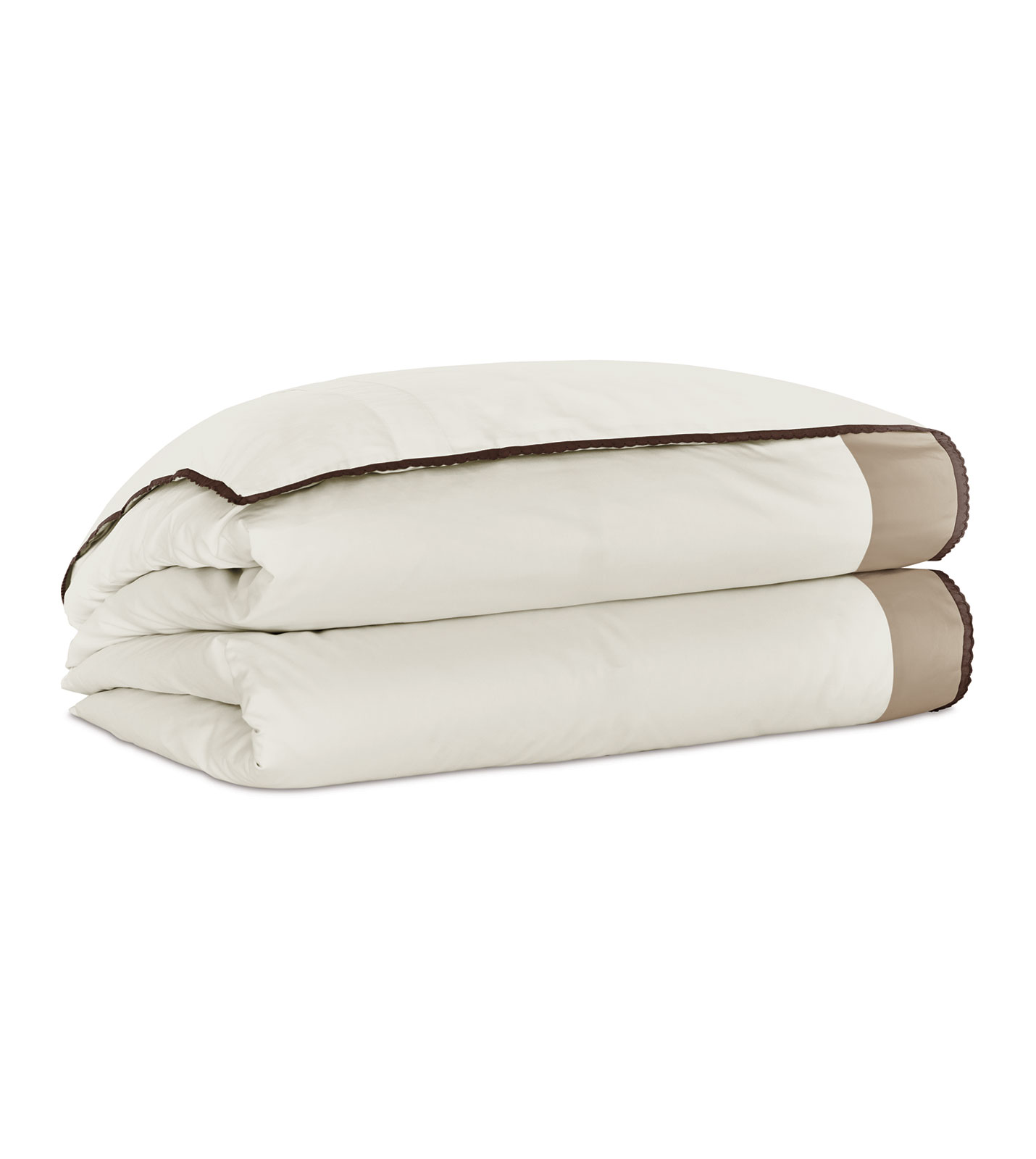 - 3" mitered border in Deluca Almond sewn on face along the edge