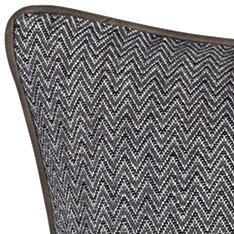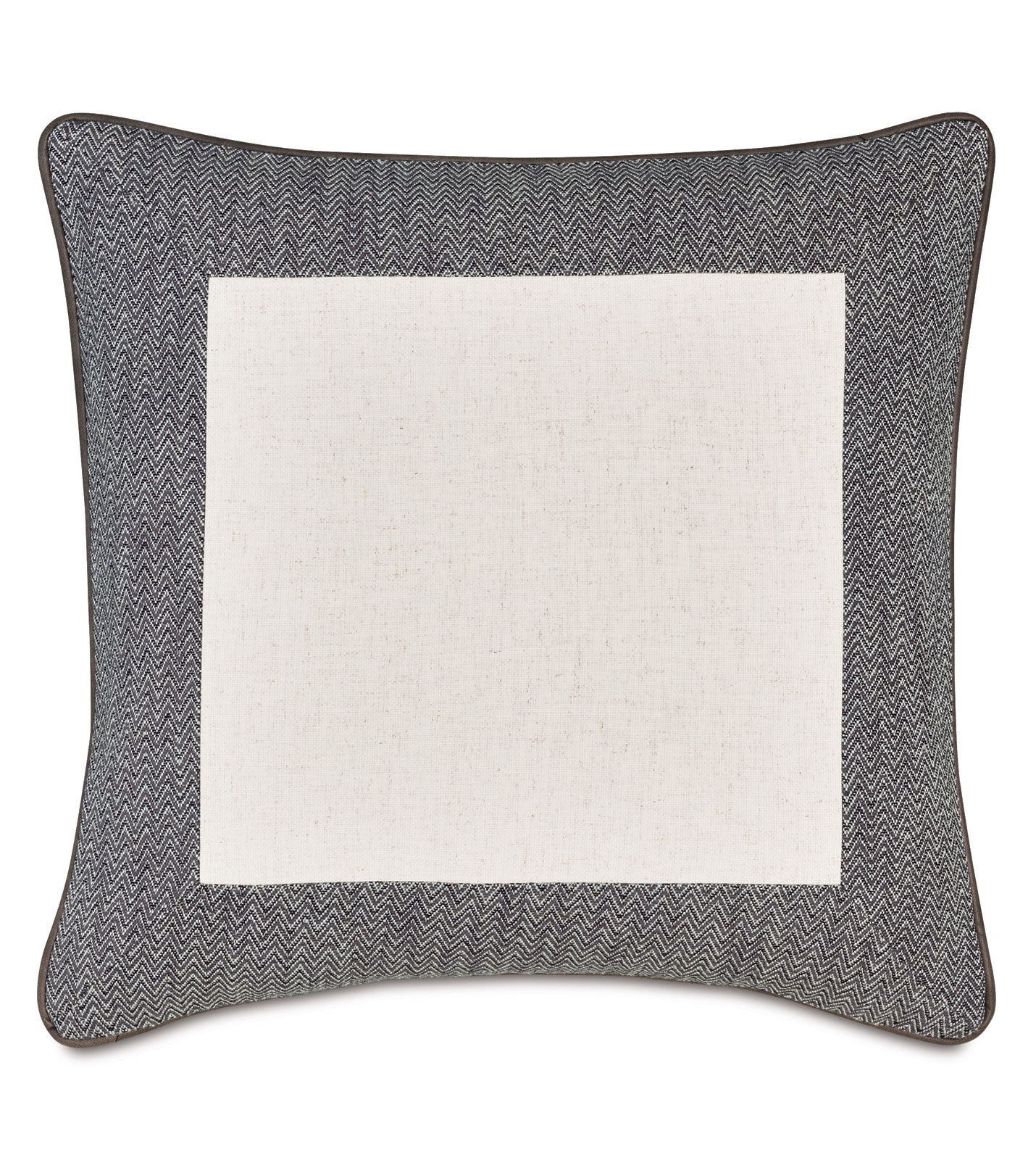 - Solid textured decorative pillow framed with a woven, herringbone fabric