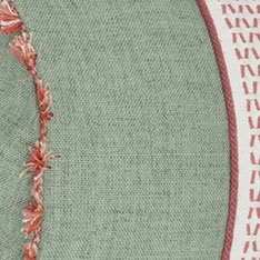 - Neckroll decorative pillow in a solid mint fabric with 2 bands of twill weave fabric and pink cord sewn on face